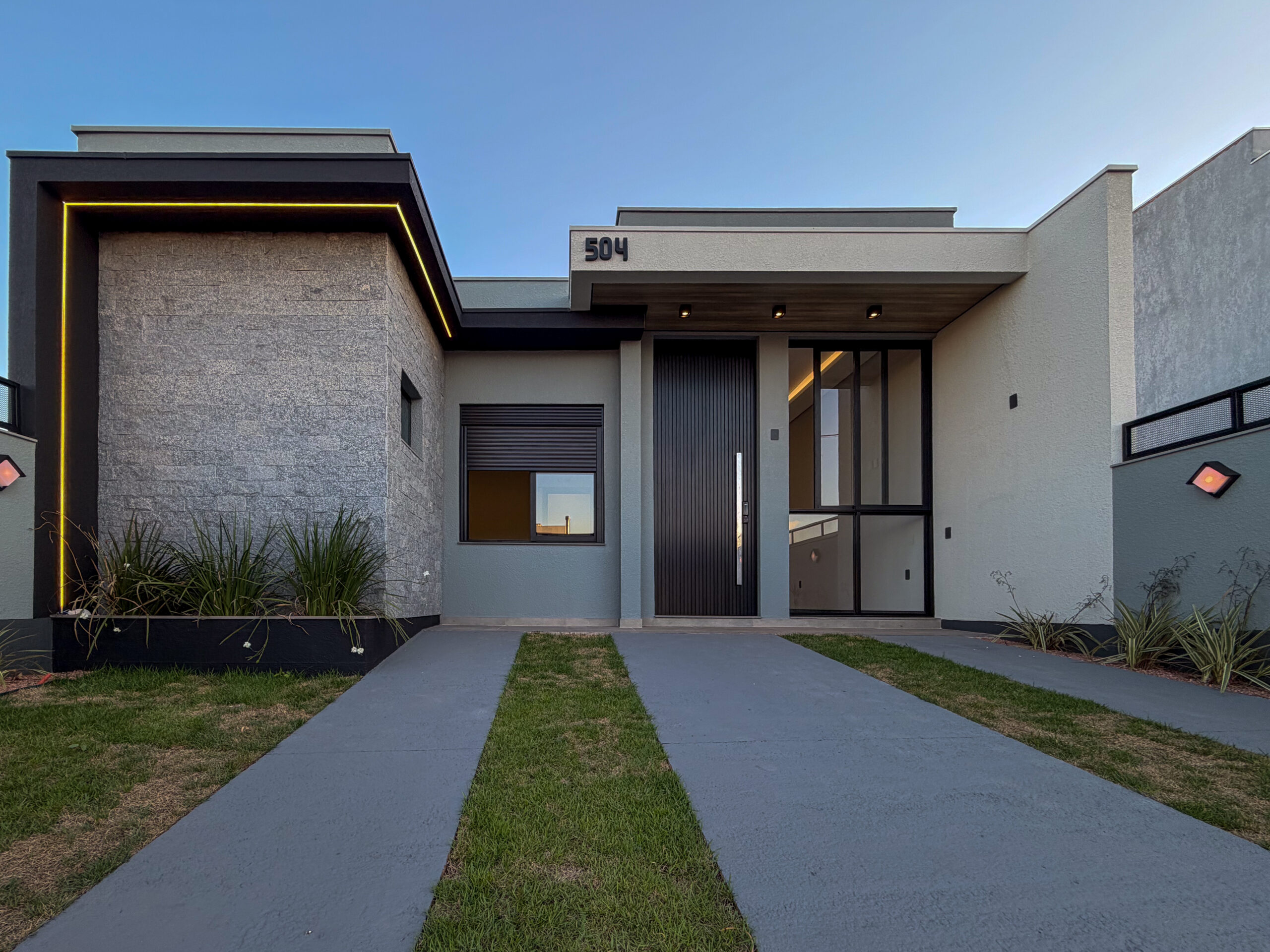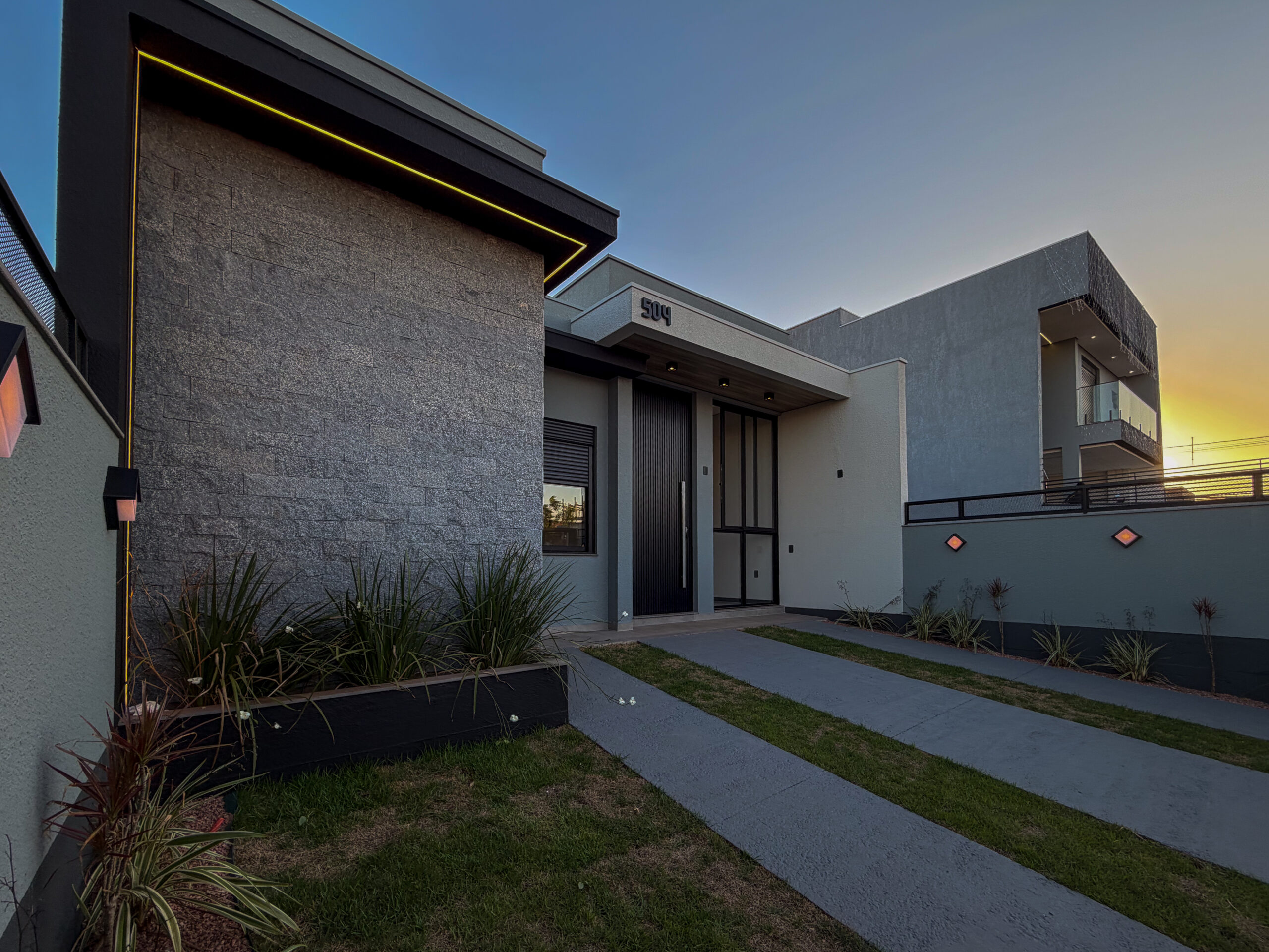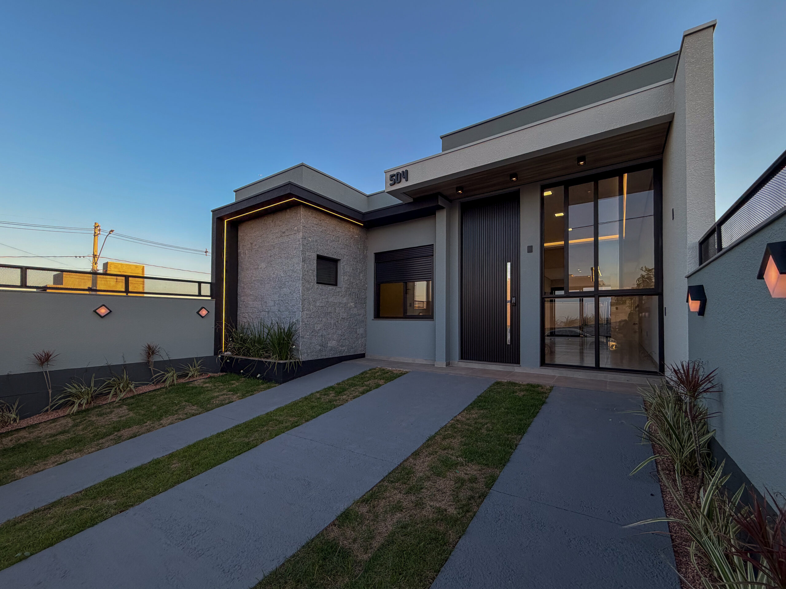 A fachada impressiona pelo design moderno, com revestimento em pedra natural e iluminação já instalada, além de porta pivotante com fechadura eletrônica, oferecendo segurança e elegância desde a entrada. O imóvel conta ainda com interruptores smart, sanca de gesso com cortineiros e tubulação de água quente na cozinha, lavanderia e banheiros.