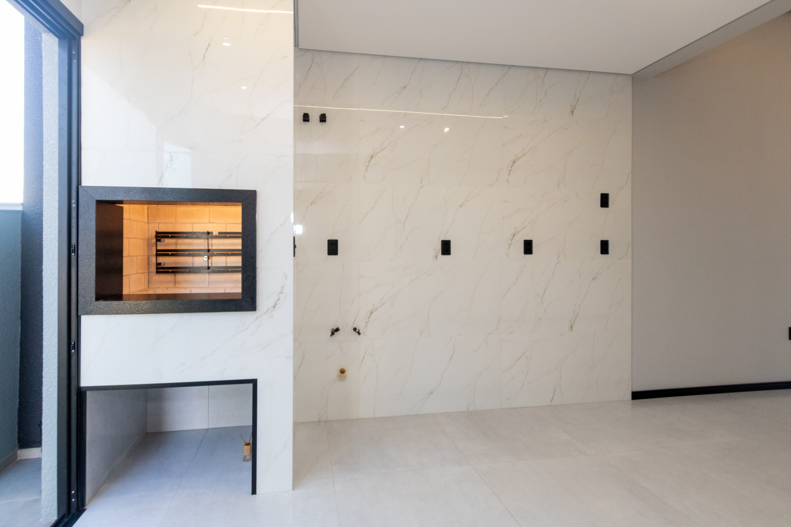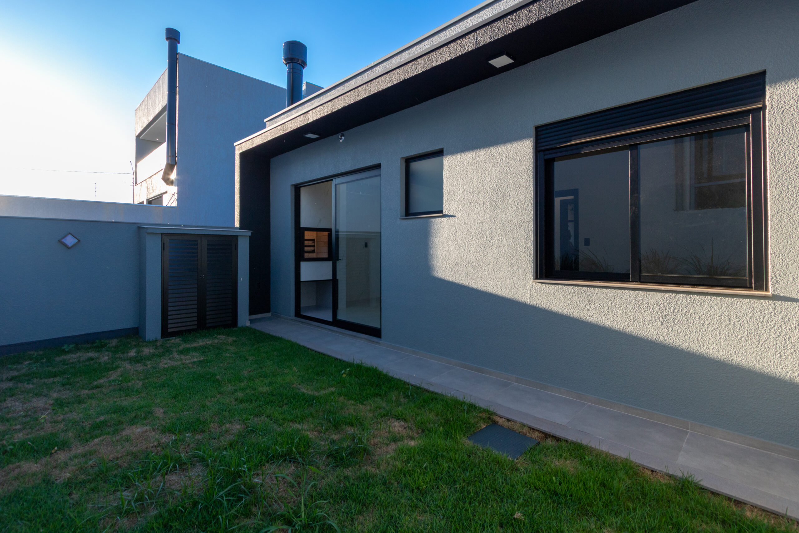 A cozinha com churrasqueira integrada é ideal para momentos de convivência, aliando praticidade e lazer. O imóvel dispõe ainda de 2 vagas de garagem e espera para piscina no pátio, ampliando as possibilidades de uso do espaço externo.